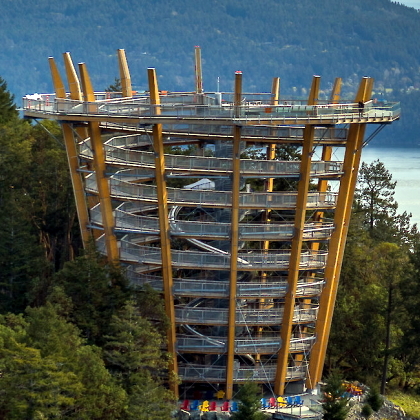 マラハットスカイウォーク・・2021年7月オープンの新しいアトラクション。!ビクトリア市内から約35Km、ダンカンに向かう手前にあります。ウェルカムセンター(カフェやギフトショップ)、ギャザリング・プレース、ツリーオォーク(広葉樹アビュータスやダグラスファーが約600m)で森のなか進み、ゆるやかならせん状の通路を歩き最上部(海抜250m)へ、美しい眺望が目の前に広がります。最上部の床は金属メッシュでアドベンチャーネットもありスリル感も楽しむこともできる。スライド(滑り台)は全長50mで下まで降りることも・・