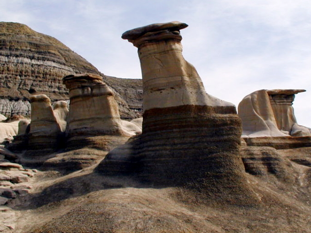 午前中にロイヤル・ティレル古生物学博物館へ。10万点を超す恐竜や古代生物の博物館をイヤホンガイド(日本語)を片手に自由に見学。この地で発見され名前がついたアルバータサウルスやティラノサウルスの骨格標本、化石からの骨格再現作業の見学など未知の世界である恐竜の世界を満喫。ドラムヘラーから東へ25km、フードゥー(奇岩)が見えてきます。砂岩と石灰岩が浸食されて層となった奇岩の柱は不思議な空間に感じます